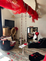 Come to this atypical 55 m² house, with its real high-end suite, its cathedral ceiling adorned with 11 dimmable chandeliers to create a timeless atmosphere for complete sharing. You will find luxurious comfort with a 2m by 2m King size bed, a TV lounge area with its round and swivel sofa, a balneotherapy and chromotherapy bathtub for two, to spend a moment of well-being and complicity. We provide you with two bathrobes and all towels for your stay. You will also find a swing, a kitchen area, equipped with a microwave, grill, hob, fridge, coffee maker, kettle. We provide coffee, tea, jam, Nutella and brioche for your arrival. Upon request, you can have our naughty box, where you will find all kinds of small accessories and objects to make you spend a surprising moment together, of course this will be accompanied by a half bottle of champagne.