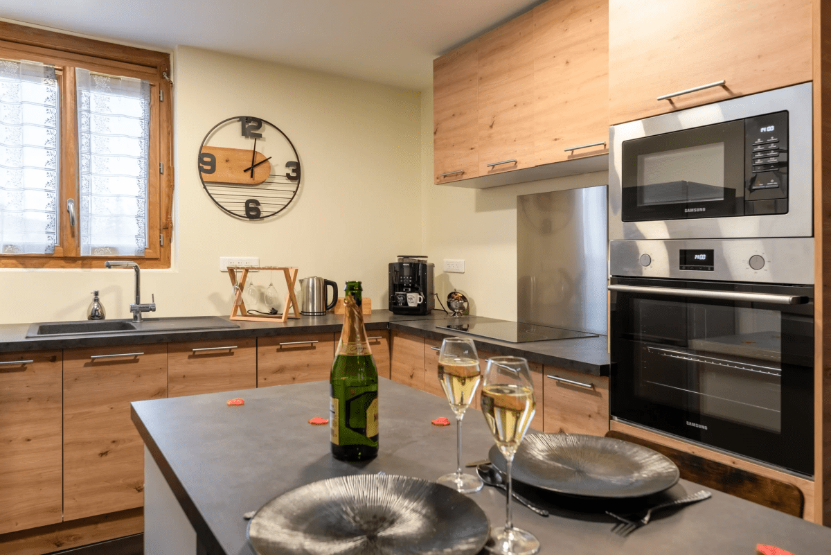 La cuisine entièrement équipée (four, micro-ondes, réfrigérateur, machine à café à grains, vaisselle complète) vous permet de savourer un repas en tête-à-tête dans une atmosphère feutrée.