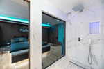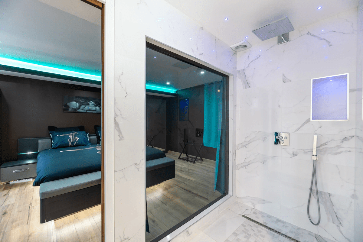 La baie vitrée entre la chambre et la douche crée un jeu de transparence subtil, idéal pour des instants de complicité.