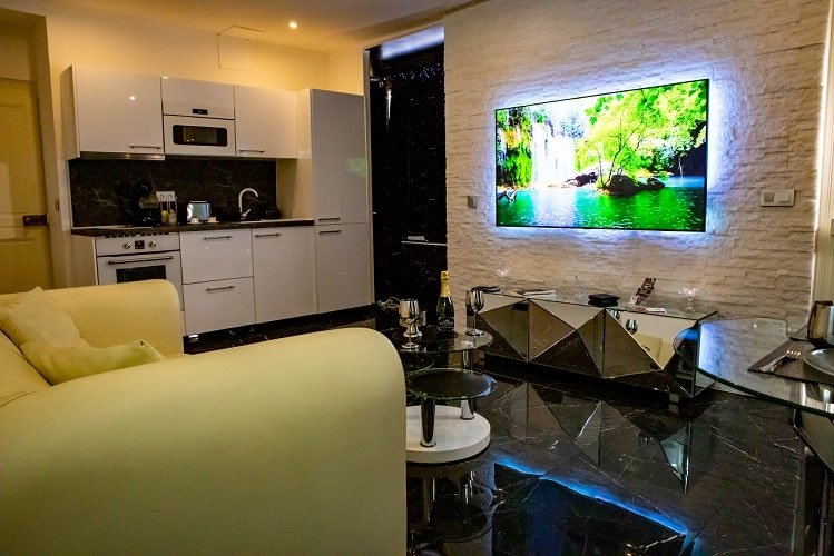 Cuisine entièrement équipée Machine à café Dolce Gusto Grille-pain Coin repas Télévision 65 pouces Décodeur TV Éclairages LED Accès Wi-Fi gratuit