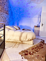 La grange épicurienne a été entièrement pensée pour passer un moment unique à deux ! Plongez dans un lieu enchanteur et romantique à souhait ! Vous pouvez agrémenter votre séjour et choisir nos repas traiteur déjà déposés à votre arrivée, ou surprendre votre moitié avec l'une de nos deux formules: la romantique ou la chasse au trésor coquine... Avec la formule romantique, faites briller les yeux de votre partenaire avec des bougies, de véritables pétales de rose, des chocolats et des photos souvenir (polaroïd). La chasse au trésor vous promet elle un beau moment de complicité avec un trésor coquin... Aussi, des massages peuvent être prodigués pendant votre soirée par des professionnels. Au réveil, savourez un copieux petit-déjeuner déposé dans votre boîte aux lettres.