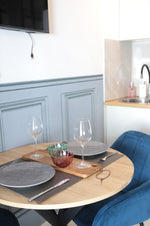Espace repas avec chaises en velours pour un dîner intimiste