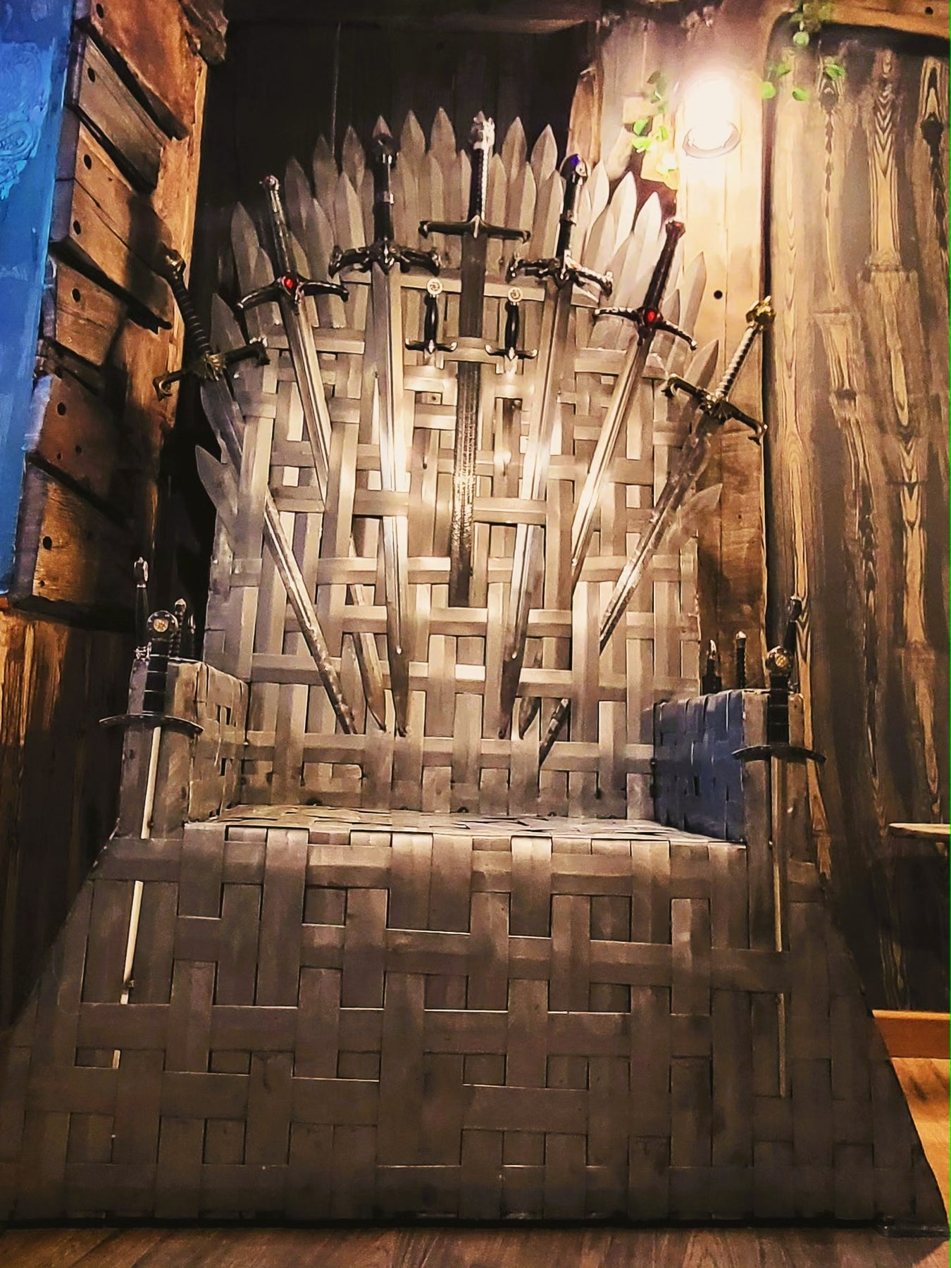 Au cœur du salon médiéval trône le Trône de Fer, reproduction fidèle et saisissante, entouré de bannières, d’armes et de symboles de pouvoir. Qui sera couronné ce soir ? Qui fléchira le genou ? Ce trône est à vous.