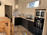 Cuisine ouverte tout équipée : frigo, plaques vitrocéramique, hotte, four, micro-ondes, vaisselle.