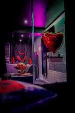 Le coin salon est équipé d’un écran plat de 140cm, d'un lecteur DVD, d'une enceinte Bluetooth, d'un accès internet, d'un éclairage d'ambiance multicolore et d'une barre de pole dance l’occasion de dévoiler votre charme irrésistible et de faire monter la température pour de purs moments de volupté.