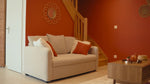 Salon cosy avec canapé, poufs, TV 165 cm, enceinte JBL et cheminée d’ambiance