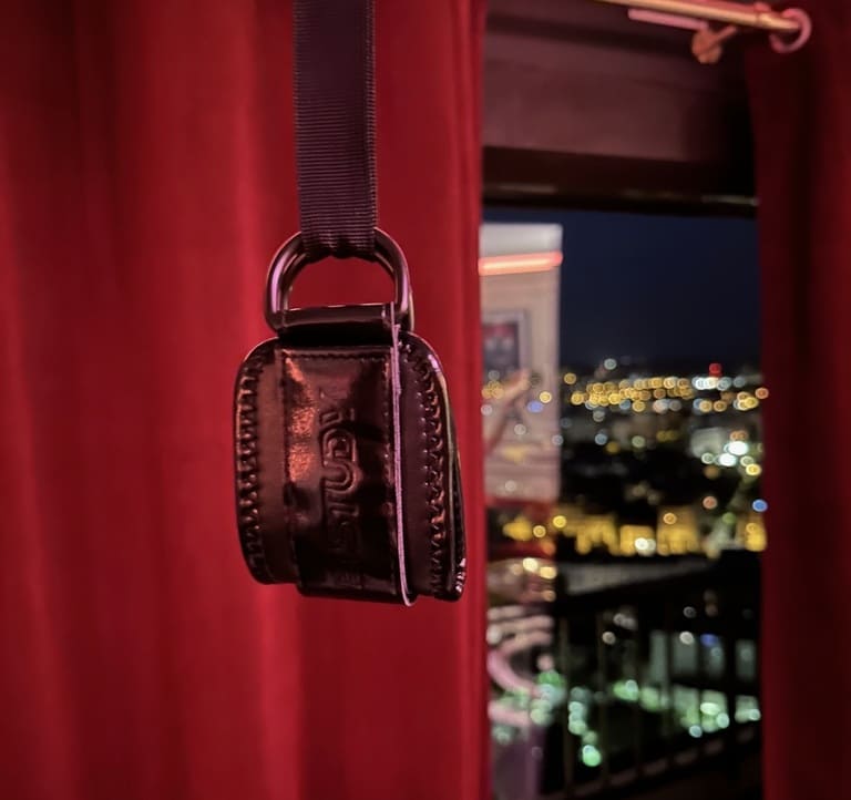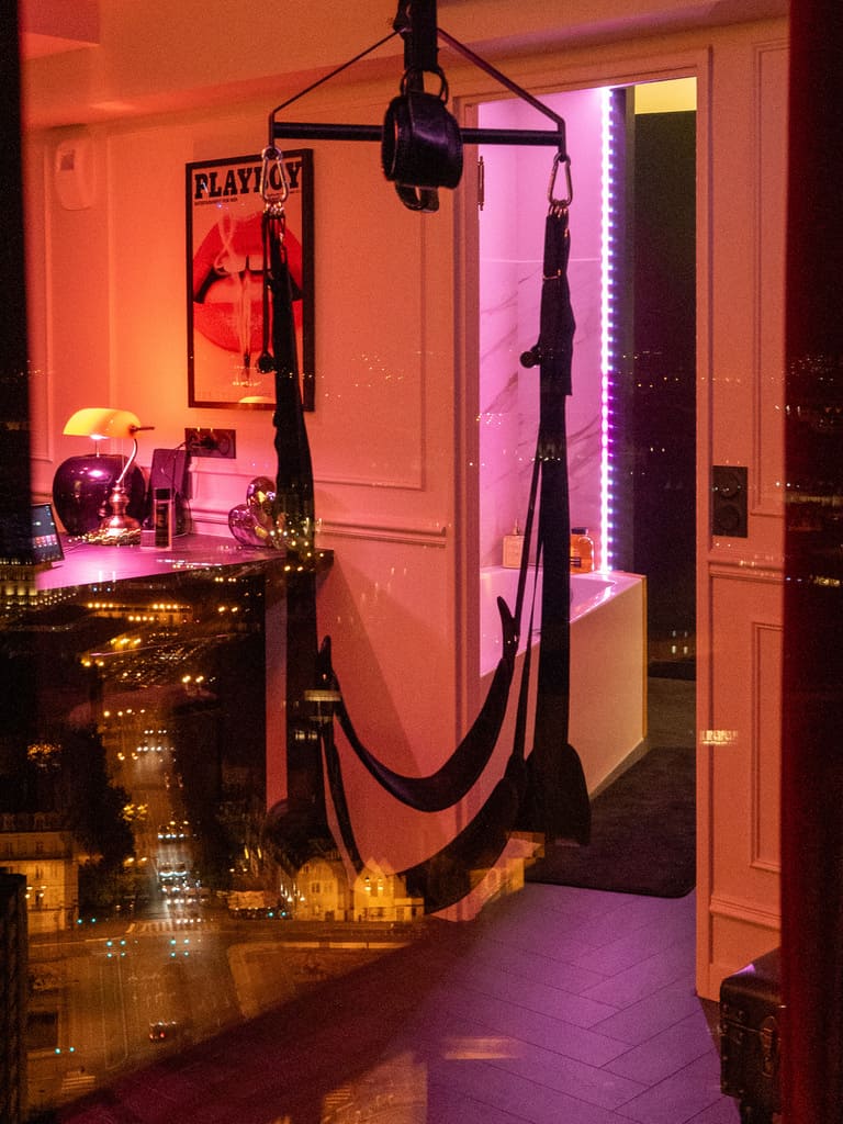 Au centre de l’appartement, une structure métallique discrète et élégante permet aux couples qui le souhaitent d’y fixer différents accessoires (balancelle, menottes, cordes…). Invisibles lorsqu’ils ne sont pas installés, ces éléments offrent une touche ludique et sensuelle, sans jamais dénaturer l’harmonie raffinée du lieu.