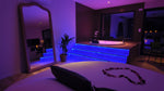Chaque suite est équipée d'une baignoire balnéo jacuzzi pour deux personnes, réglée à 38°, offrant un massage intégral et une cascade pour un bien-être absolu. La chromothérapie intégrée contribue à une détente complète du corps et de l'esprit, créant une atmosphère apaisante idéale pour se retrouver en amoureux.