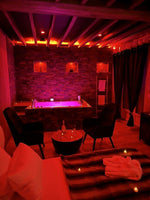 Détendez-vous dans votre **jacuzzi privatif**, situé directement face au lit, pour des moments de relaxation uniques à deux, dans une atmosphère sereine et intime.