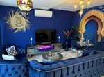 Deux univers s'offrent à vous : son salon à la décoration soignée bleu majorelle avec sa porte orientale, son meuble cheminée led, sa grande télévision, son espace diner romantique et ses canapés en velours