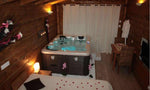 Vous découvrirez un décor romantique surmonté d'un plafond en poutres apparentes, orné d’un ciel étoilé multicolore, et d'un magnifique feu de cheminée.