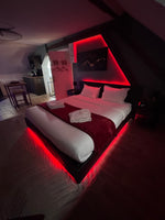Dans cette love room avec spa privatif, tout a été pensé pour créer une ambiance élégante et intimiste :