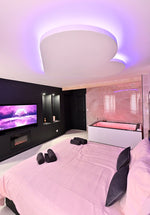 L’éclairage subtil et les textures enveloppantes créent une ambiance sensuelle et apaisante, idéale pour se préparer ou s’abandonner à la détente avant une nuit d’émotions partagées.